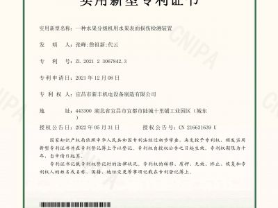 實用新型專利證書《一種水果分級機用水果表面損傷檢測裝置》